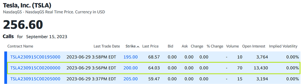 נסתכל על מניית TSLA שנסחרת כרגע ב 257.5$ ונבחן את אופציית LONG CALLעמוק בכסףל 15/09/2023 המסומנת:
