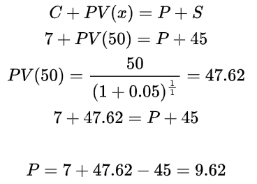 ניקח דוגמה פשוטה ונאמר שיש לנו אופציית CALL ואופציית PUT על אותו נכס הבסיס, לאותו תאריך פקיעה ולאותו סטרייק של 50$. מחיר נכס הבסיס הנוכחי (S) הוא 45$, ריבית חסרת הסיכון (r) במשק היא 5% ועלות אופציית ה CALL היא 7$.