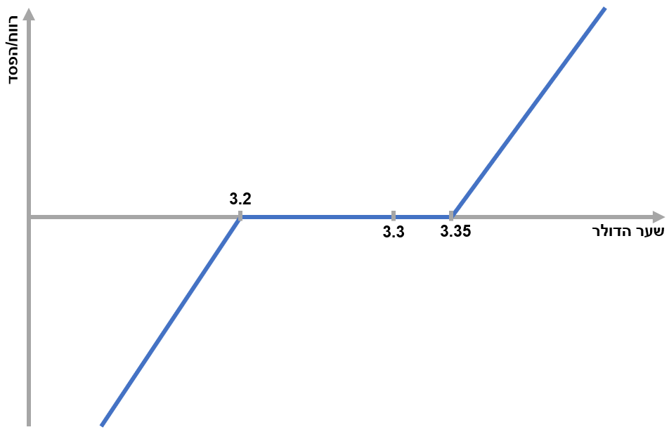1. הגנה מפני התחזקות הדולר מול השקל - בהנחה ואני יבואן (קונה דולר), ארצה לשמור על שער דולר נמוך ככל האפשר כך שהתחזקות הדולר לא תהווה איום על הכנסותיי, אם כך נוכל לקנות אופציית CALL בשער גבוה יותר ולמכור אופציית PUT בשער נמוך יותר. לדוגמה, נאמר ששער הדולר כרגע עומד על 3.3 ש"ח, נוכל לקנות אופציית CALL על 3.35 ולמכור אופציית PUT על 3.2. במידה והדולר עולה מעל 3.35 ש"ח, אנחנו מוגנים באופן מלא מפני התחזקות הדולר ומרוויחים מהעלייה. במידה והדולר יורד עד3.2 אנחנו נהנים מהירידה של הדולר בתור יבואנים. במידה והדולר יורד מתחת ל 3.2, אנחנו לא נהנים מהירידה ונכנסים להפסד כמתואר בגרף הפקיעה.
