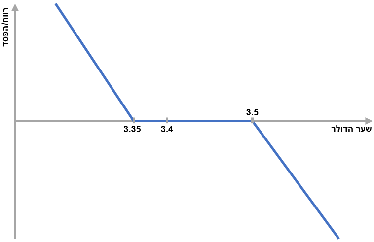 2. הגנה מפני החלשות הדולר מול השקל - בהנחה ואני יצואן (מוכר דולר)/מנהל תיק השקעות דולרי, ארצה לשמור על שער דולר גבוה ככל הניתן כך שהחלשות הדולר לא תהווה איום על הרווחים והפעולות שלי. אם כך, נוכל למכור אופציית CALL בשער גבוה יותר ולקנות אופציית PUT בשער נמוך יותר. לדוגמה, נאמר ששער הדולר כרגע עומד על 3.4 ש"ח, נוכל למכור אופציית CALL בשער 3.5 ולקנות אופציית PUT בשער 3.35. מנקודה 3.5 ומעלה אנחנו נכנסים להפסד, מנקודה 3.35 ומטה אנחנו מרוויחים מהירידה כמתואר בגרף הפקיעה