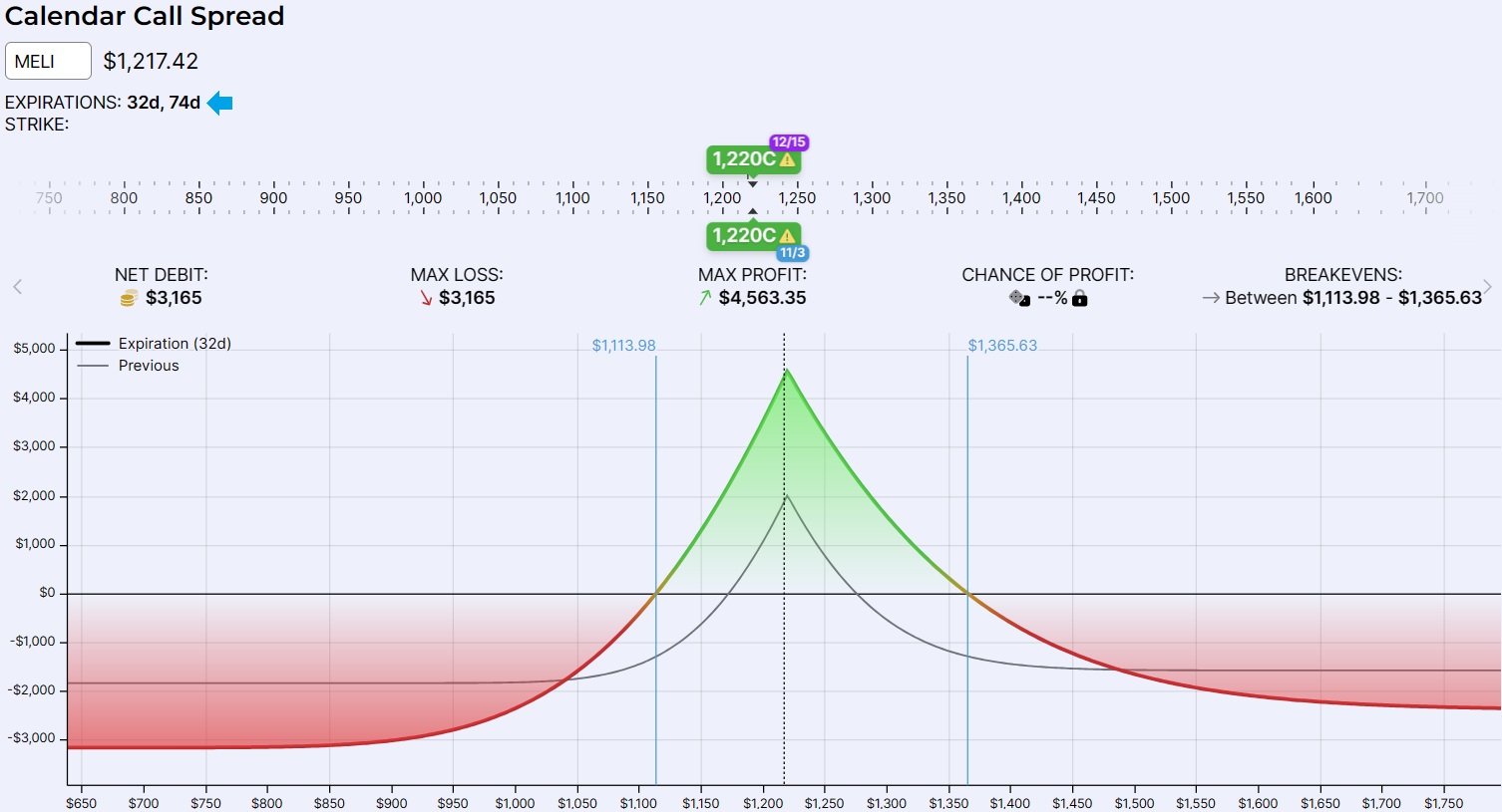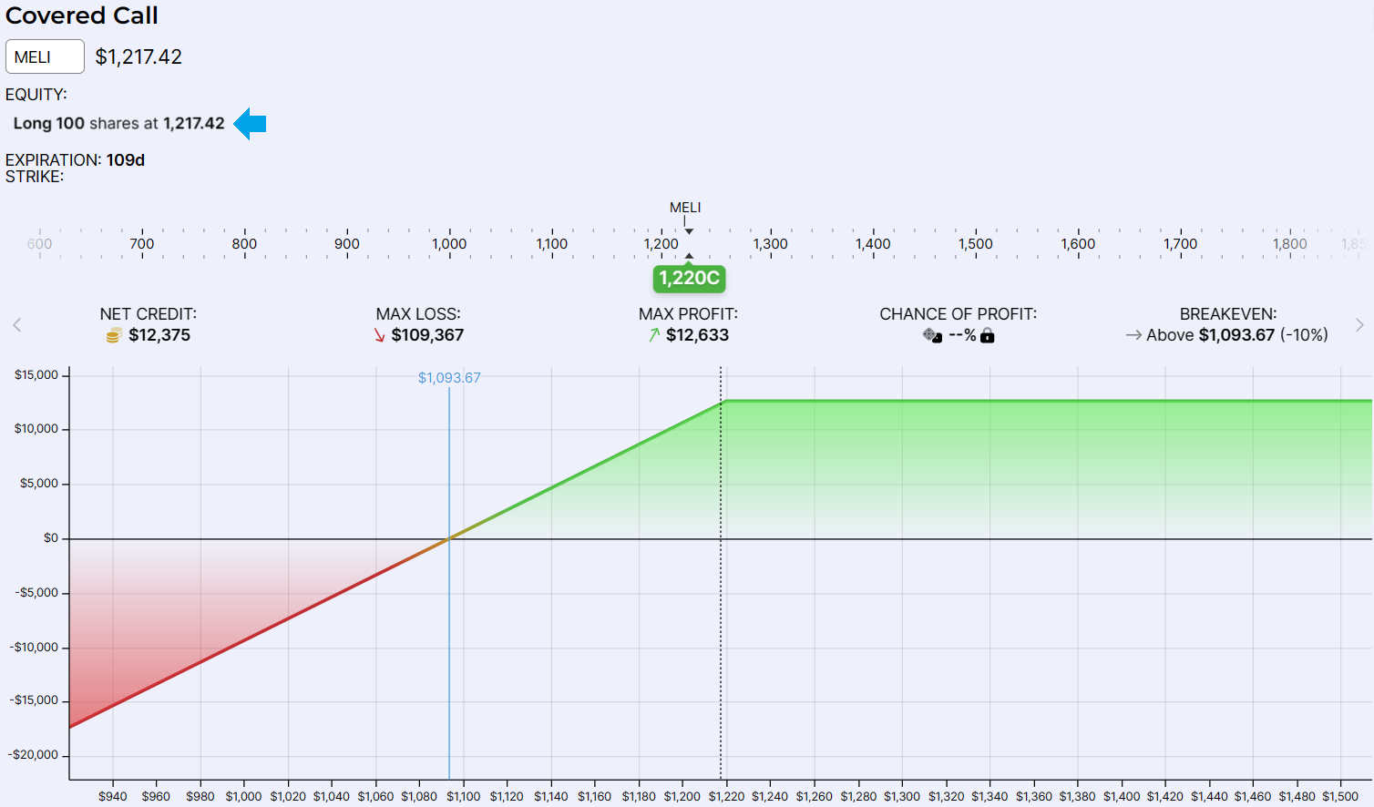 בפעם הקודמת דיברנו על אסטרטגיית COVERED CALL, אני רוצה לקחת את האסטרטגיה הזאת צעד אחד קדימה ולהציג את הצורה הממונפת שלה - אסטרטגיית מרווח זמן או CALENDAR SPREAD בלעז. נתחיל בתזכורת קצרה. באסטרטגיית COVERED CALL השתמשנו בעיקר כאשר סברנו כי השוק עשוי לדשדש או לרדת קצת במהלך חיי האופציה, לכן רכשנו 100 נכסי בסיס וכתבנו CALL אחד מחוץ לכסף. אבל, מה אם מניה מסוימת נסחרת בשער של 1500$ ואנחנו ממש מאמינים ש COVERED CALL זו האסטרטגיה הנכונה עבורה?. היינו צריכים לרכוש 100 מניות בעלות של 150,000$ ולכתוב CALL מחוץ (או ממש קרוב) לכסף. מה אם אין לנו 150,000$ "להשכיב" כרגע במניה? מה אם יש לנו אבל לא בא לנו לסכן את כל ה 150,000$?. כאן בדיוק נכנסת לתמונה אסטרטגיית מרווח זמן שבגדול מחליפה את רכישת נכס הבסיס ברכישת CALL לתאריך פקיעה רחוק מאוד. נציג דוגמה של COVERED CALL על מניית MELI ולאחר מכן נראה את ה CALENDAR SPREAD השקול. מניית MELI נסחרת נכון לרגע כתיבת שורה זו ב 1,217.42$. נאמר שאנחנו מאמינים שהמניה הולכת לדשדש קצת במשך 109 ימים הבאים והחלטנו שהדרך הנכונה לפעול היא באמצעות אסטרטגיית COVERED CALL. אם כך, נקנה 100 מניות MELI בעלות של 121,742$ ונכתוב את CALL 1220$. מכתיבת ה CALL נקבל פרמיה של 12,375$. נקודת האיזון שלנו היא 10% מתחת למחיר המניה הנוכחי, ב 1,093.67$. לפנינו גרף הפקיעה