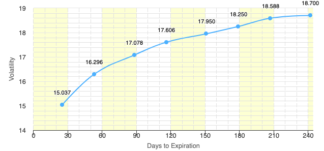 כלומר גרף דומה מאוד ל ln(x). גרף זה הוא גרף Contango קלאסי שאומר שהחוזה השני יקר יותר מהחוזה הראשון כאשר הפערים העתידיים מתחילים לשאוף ל 0 והעקום משתטח. ממוצע ההפרש בין החוזה הראשון לחוזה השני בדרך כלל עומד על 9%-10%. זה למעשה אומר שבממוצע כל יום שעובר, בנוסף לחלק שמנהל תעודת VXX מוכר כדי לשמור על מח״מ 30 יום (ה 5% שהסברנו מקודם), הוא מוכר בערך ב 10% ממוצע פחות. כלומר עם סכום הכסף שהוא מוכר, הוא קונה 10% פחות חוזים כל יום ב 5% מערך התעודה בקירוב. הגרף ההפוך מ Contango, נראה כך: