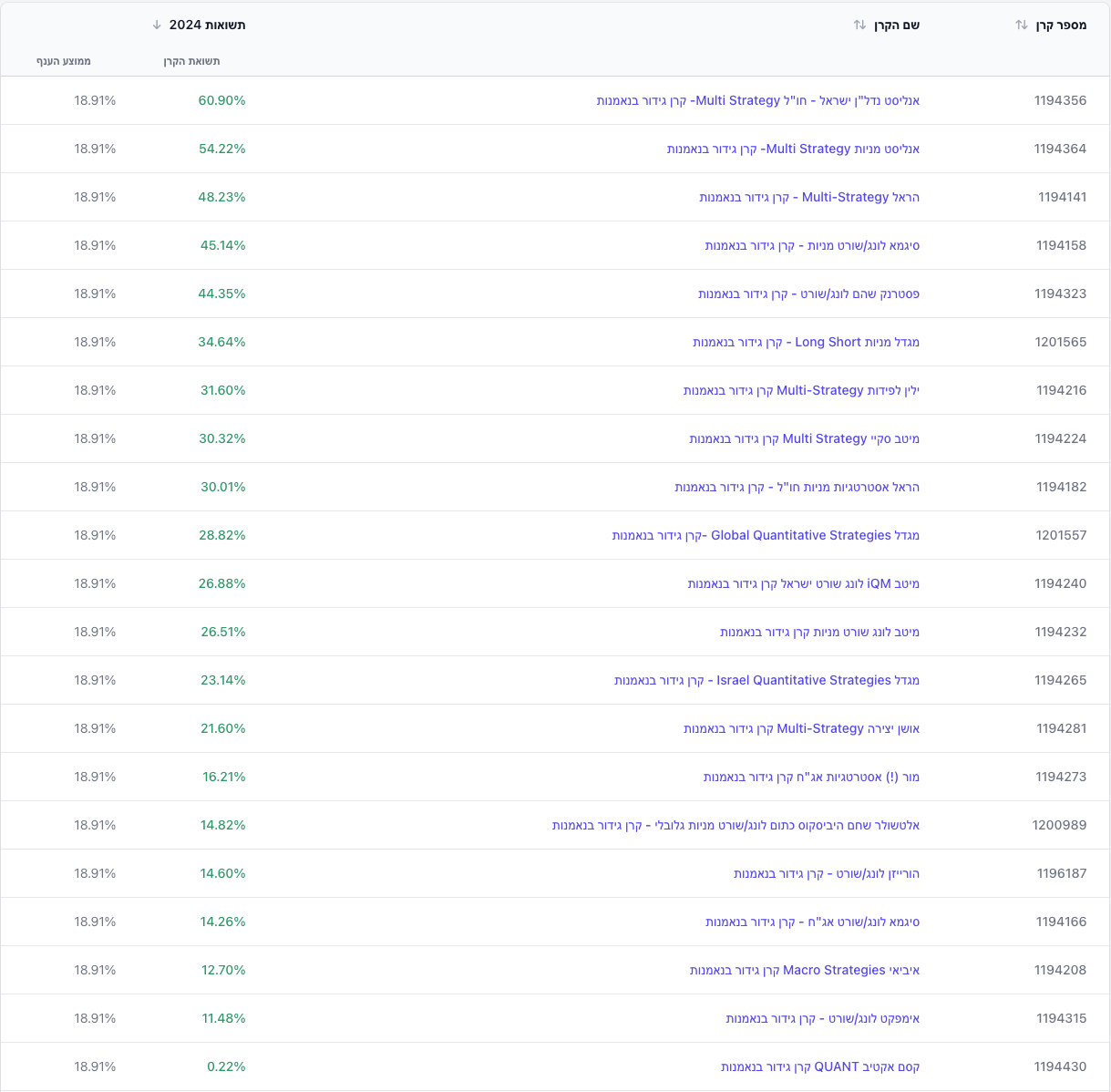 - סוג האחזקות והאסטרטגיה – חשוב להבין באילו נכסים הקרן משקיעה: האם היא מתמקדת במניות (כמו "אנליסט מניות מולטי-סטרטג'י"), באגרות חוב (כמו "מור אסטרטגיות אג"ח"), או בשימוש בנגזרים, במכירה בחסר (שורטים) וחשיפה למטבע זר. כך תוכלו להעריך את רמת הסיכון, הגיוון וההתאמה לפרופיל ההשקעה שלכם.